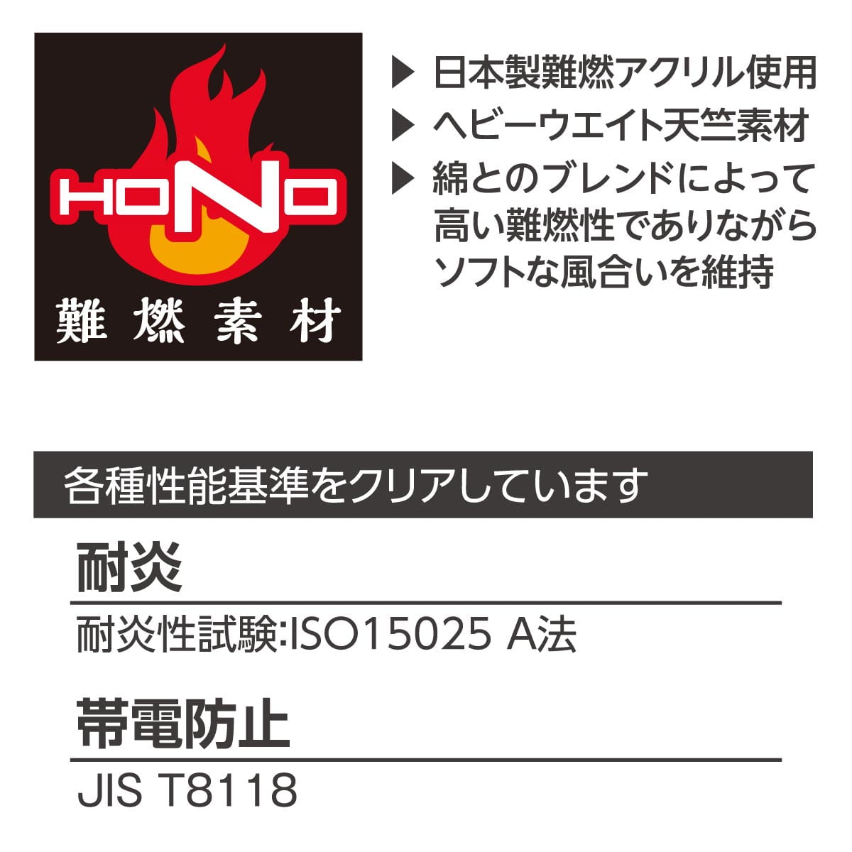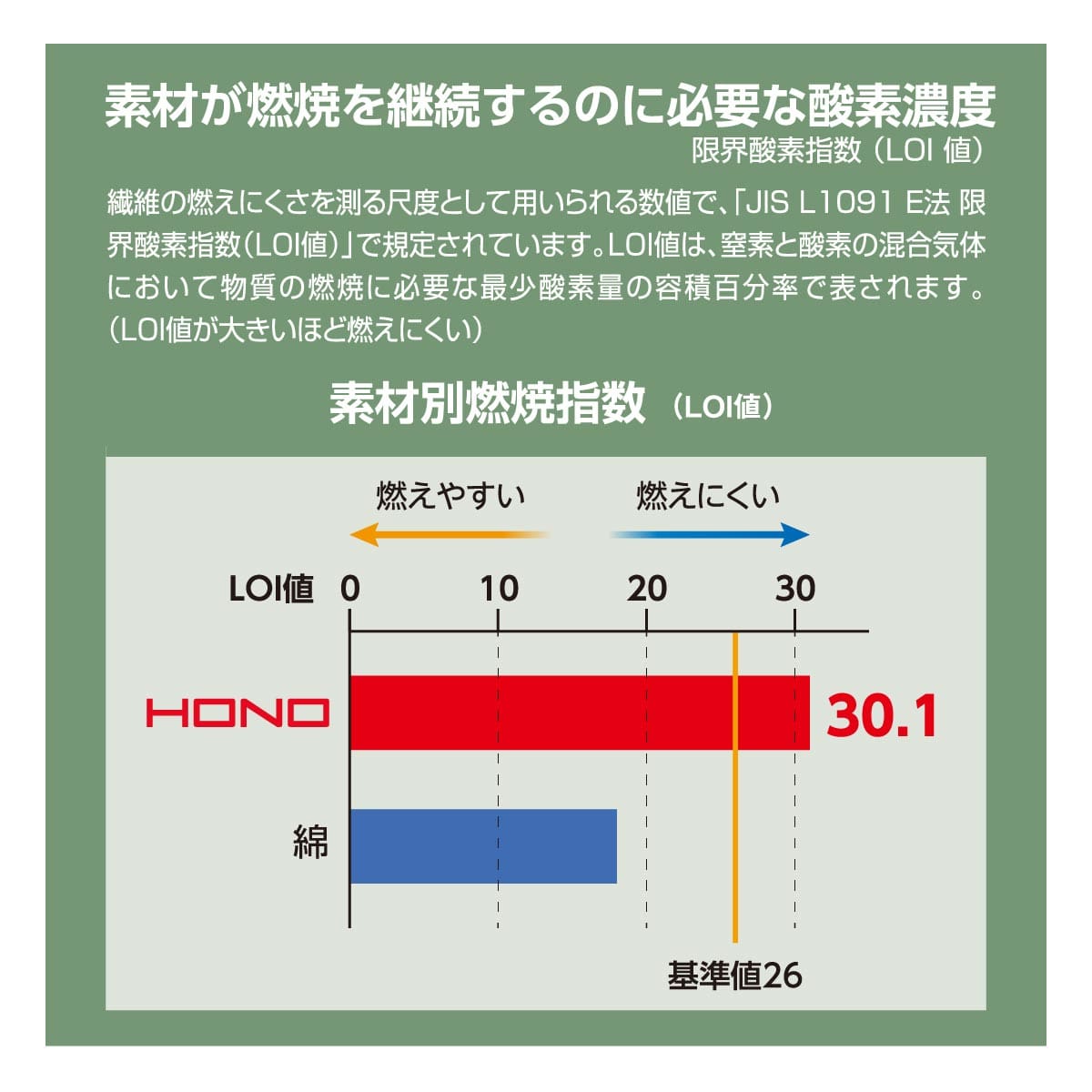 優れた難燃性能「LOI値 30.1」 火の粉が当たっても燃え広がりにくい優れた自己消火性を備え、火気を扱う現場の安全をサポートします。