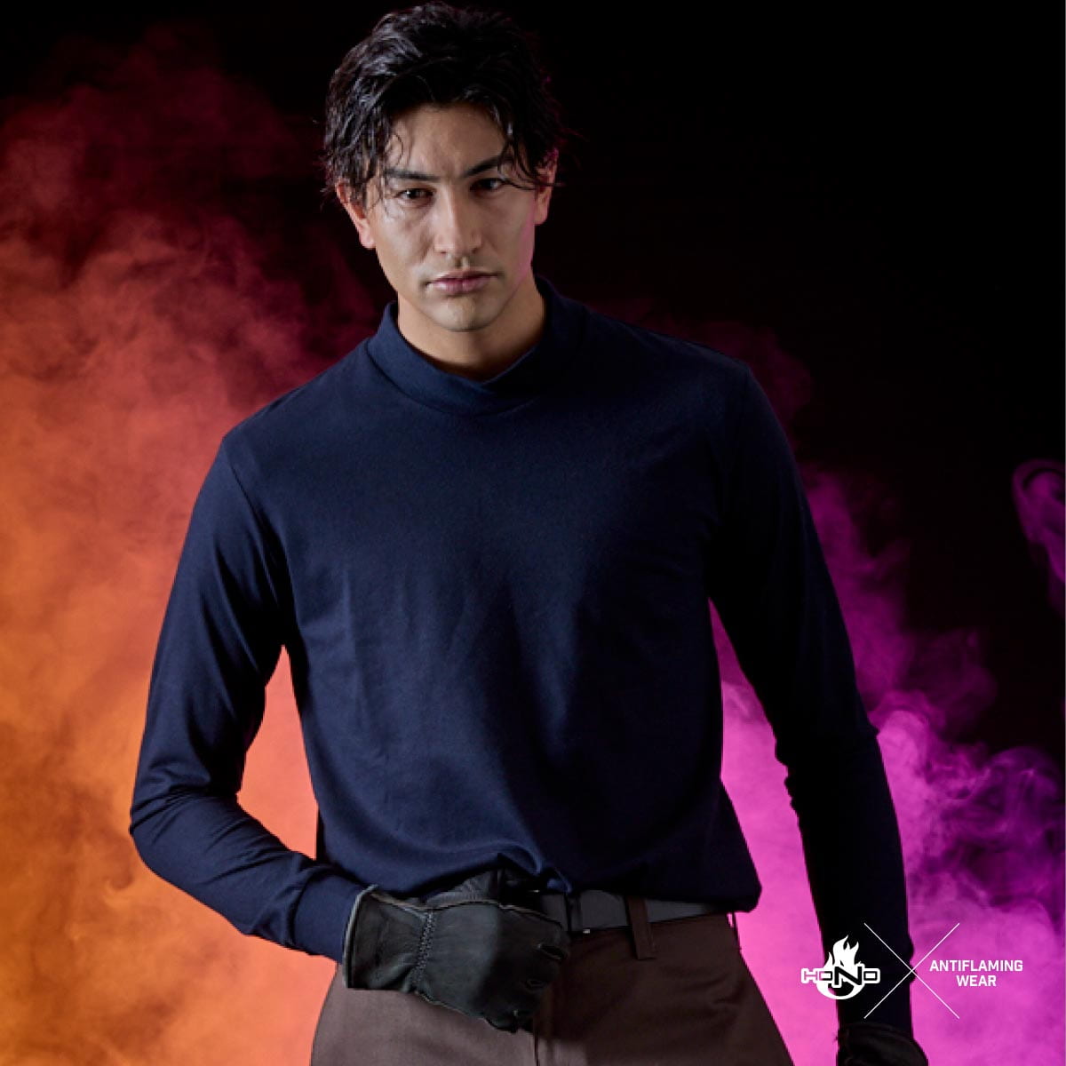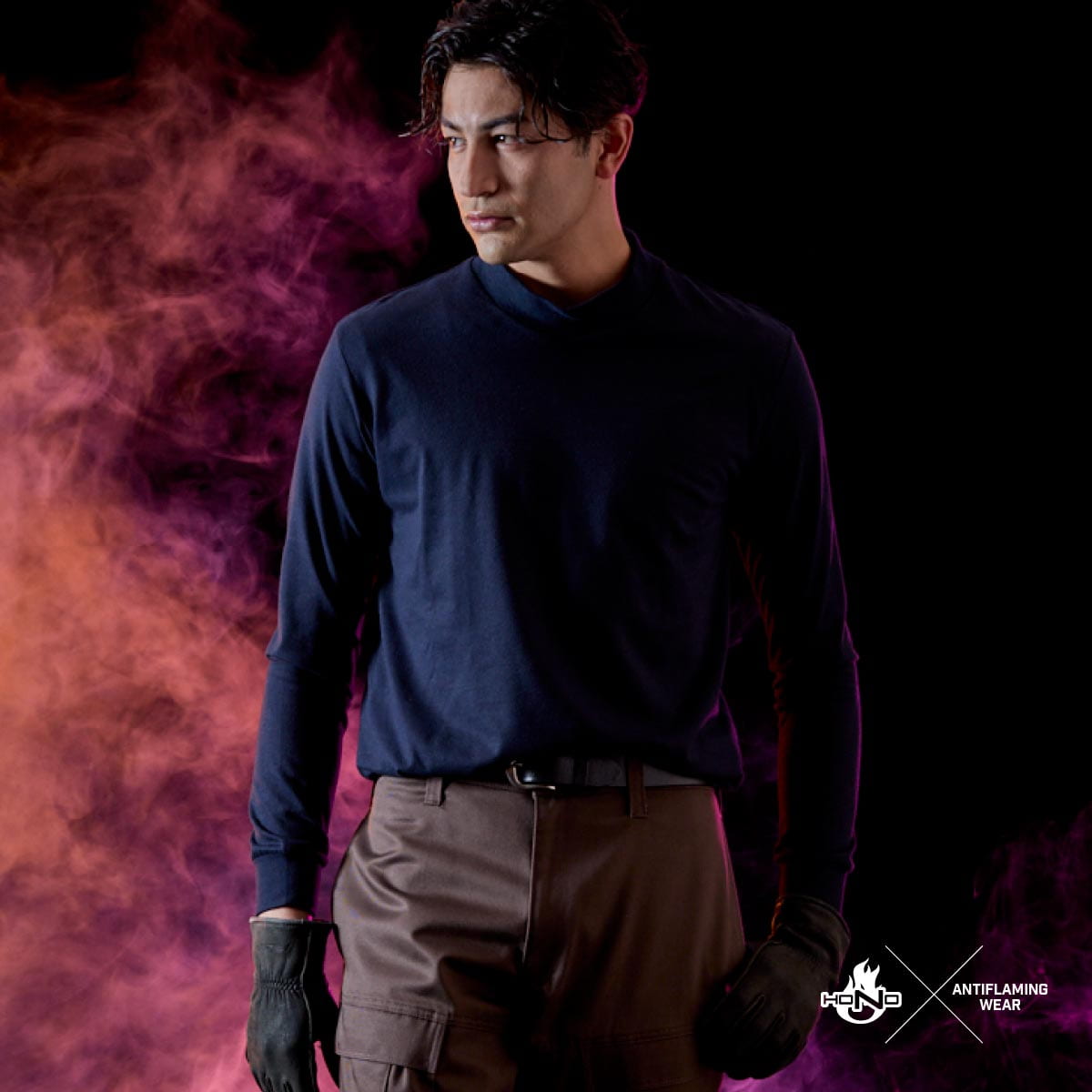 日本製難燃アクリルをベースに綿・ナイロンを黄金比でブレンド。火気や静電気を扱うプロのために開発された、高機能ヘビーウェイト天竺シャツです。