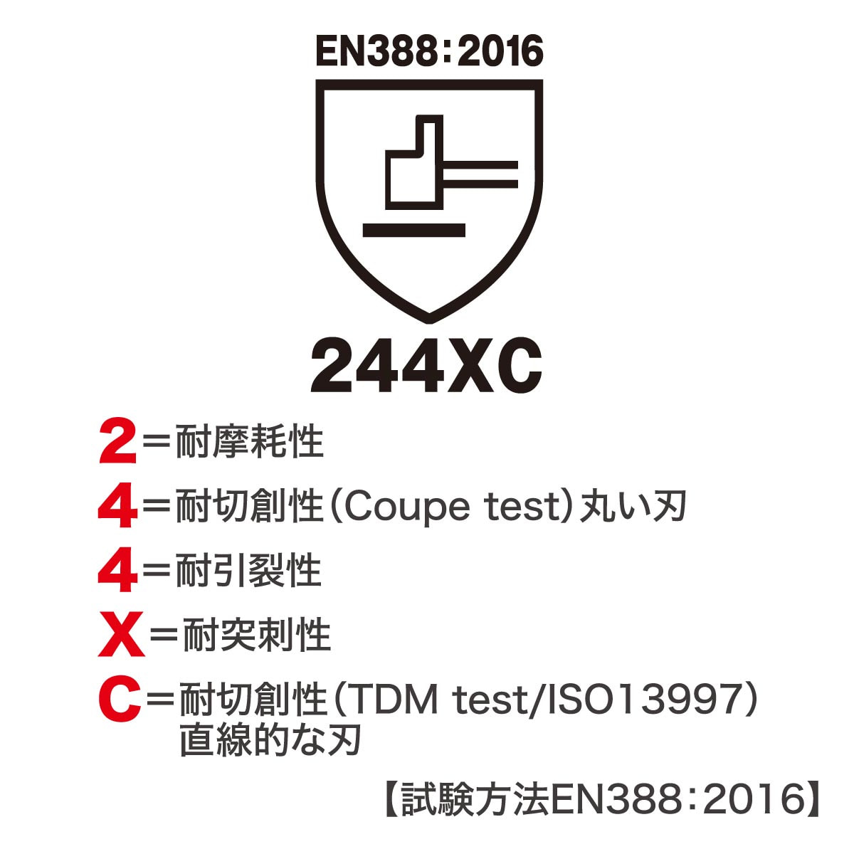確かな安全性「レベル4C」 試験方法EN388:2016にて「244XC」をマーク。鋭利な資材や刃物を扱う現場での切り創リスクを軽減します。