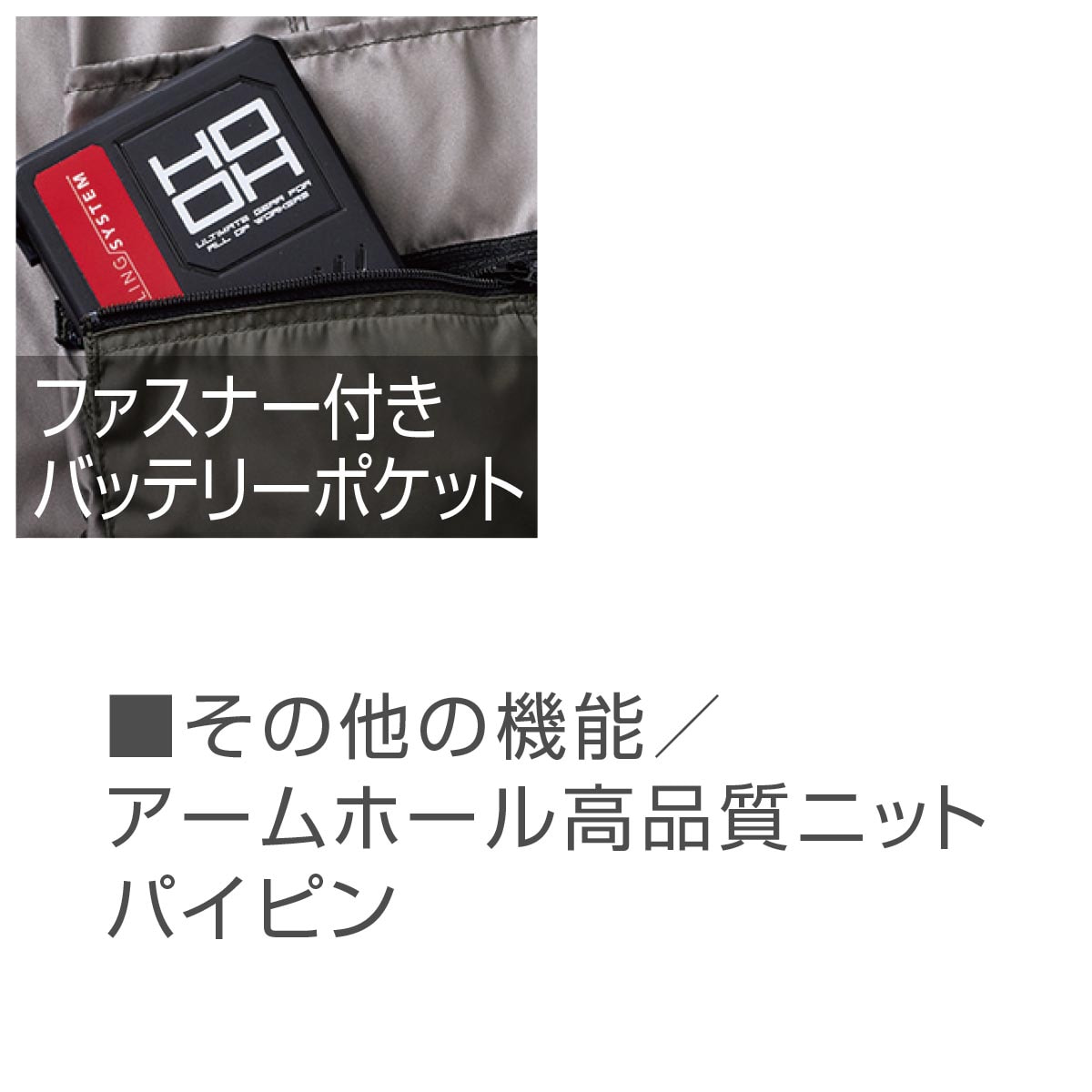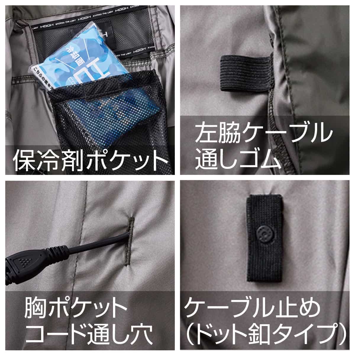 背中からしっかり涼しい「保冷剤ポケット」 背中内側に保冷剤収納ポケットを装備。ミドルファンが送り出す風が背中全体を駆け巡り、保冷剤の冷却力と相まって驚きの涼しさを体感できます。