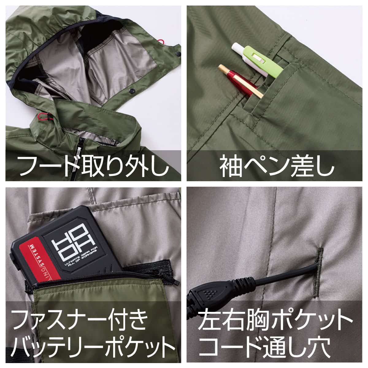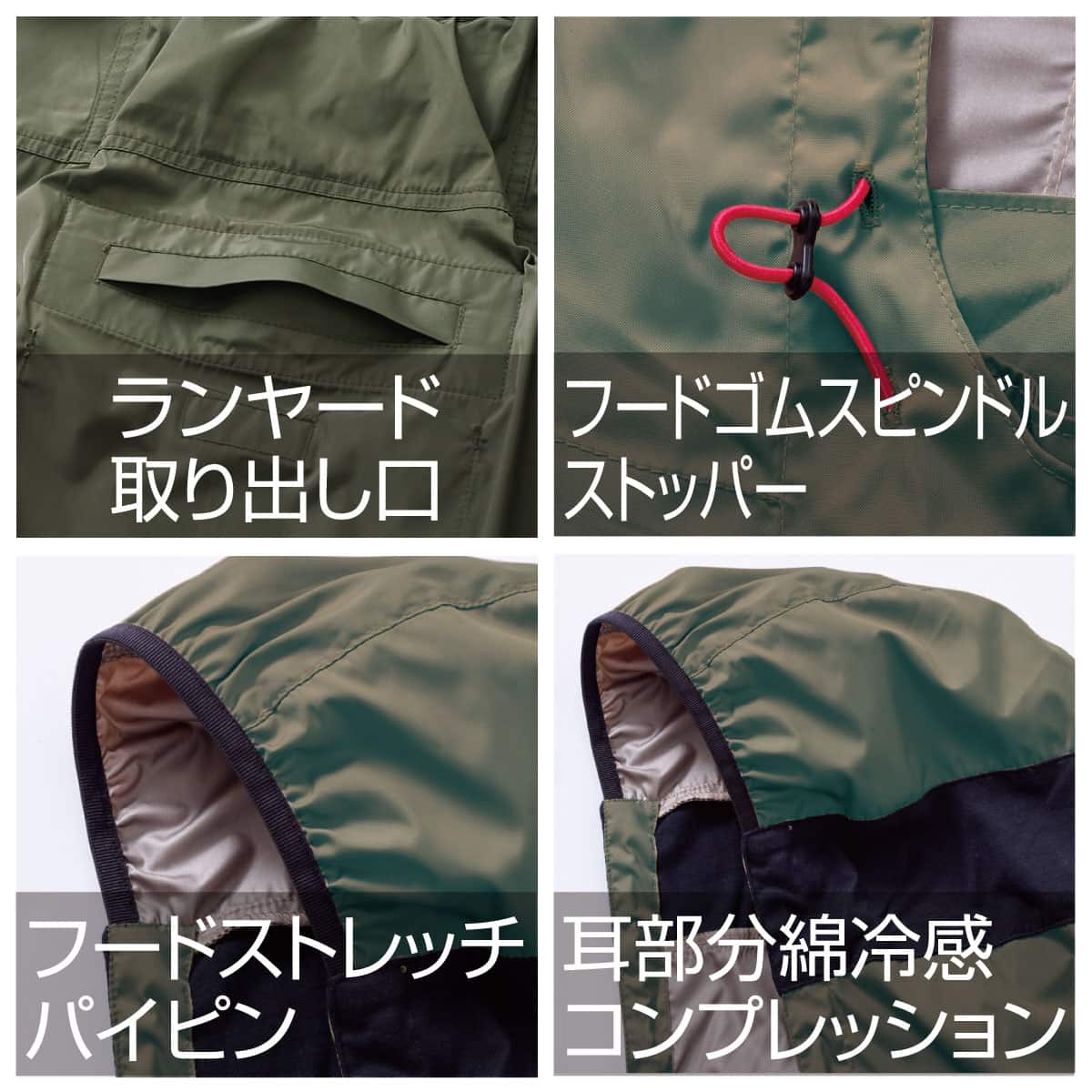 プロ仕様の快適機能 消臭テープ内蔵でニオイをカット。フードは着脱可能で、ヘルメット着用時などシーンに合わせたスタイルが選べます。